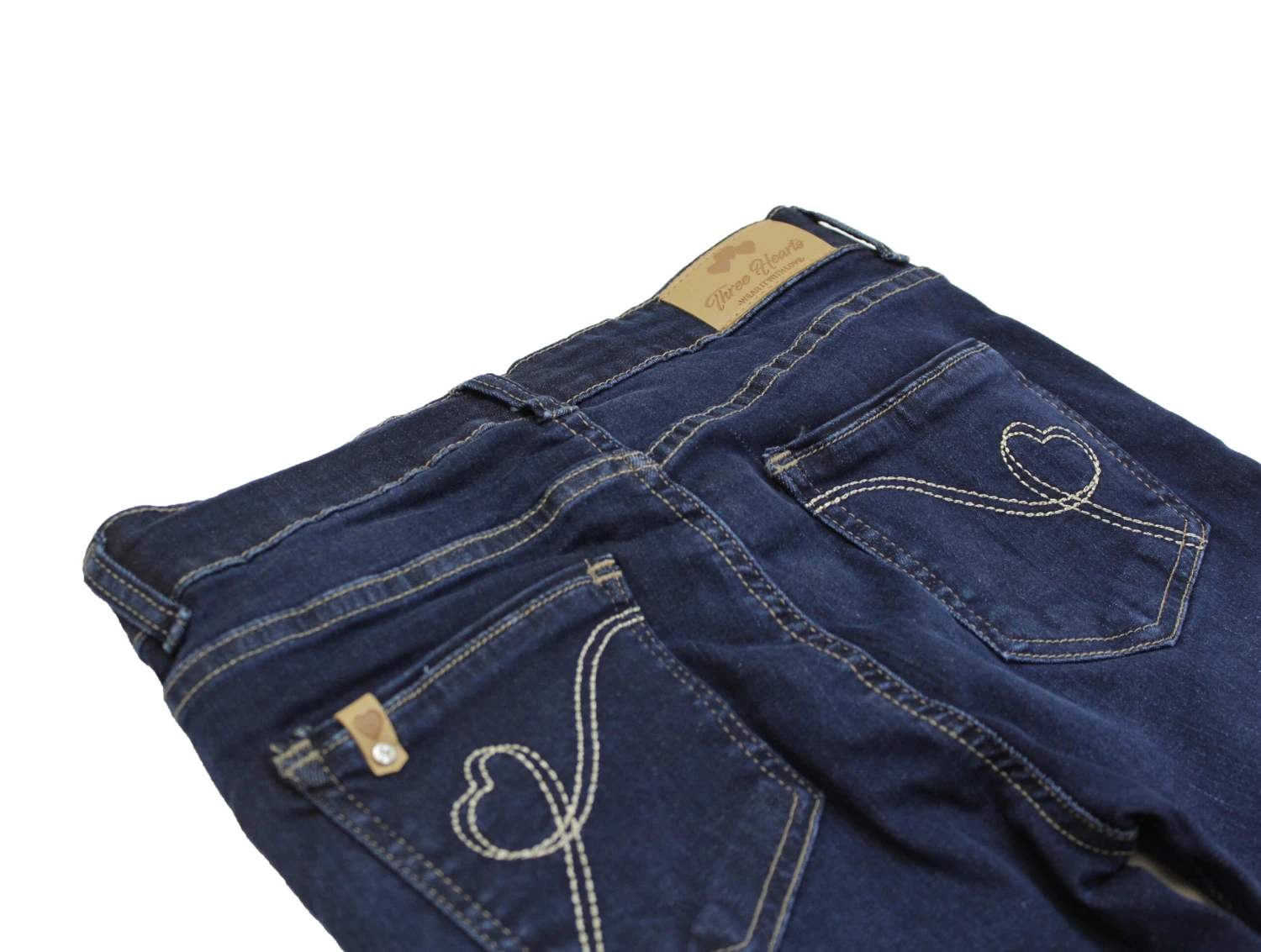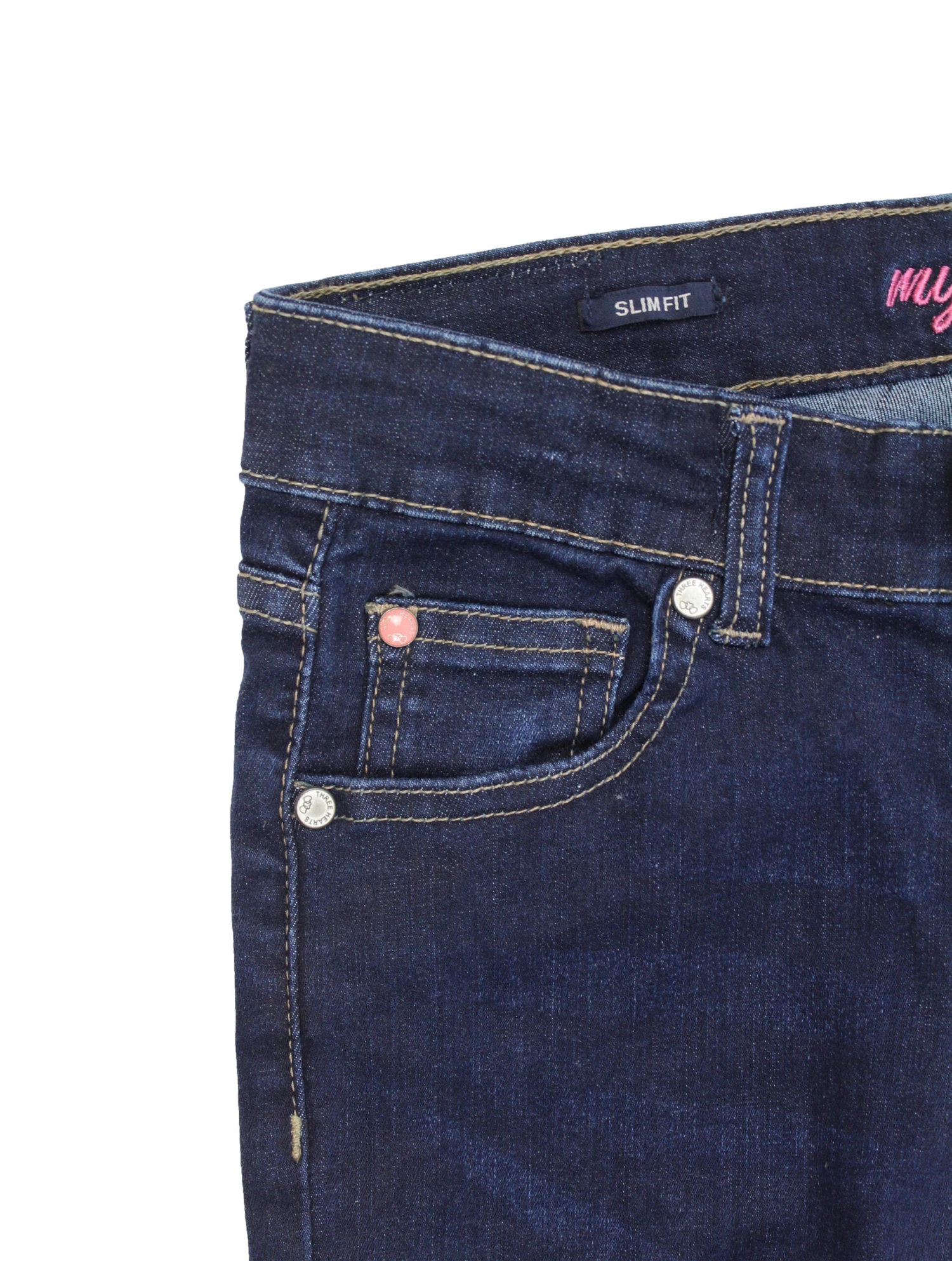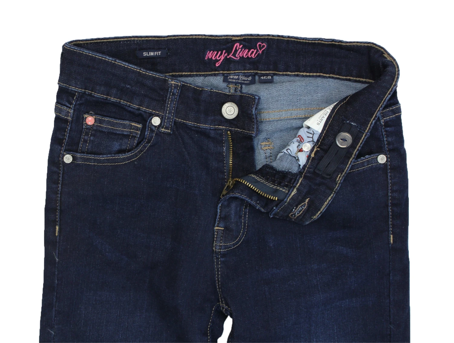 Slim Fit – Five Pocket Jeans in der Waschung „Stone Wash Used“, hoher Tragekomfort durch angenehm weichen Stretch Denim, größenverstellbarer Innenbund, Nieten und Knopf mit Logo in matt silber, Knopf und Reißverschluss, Kunstleder Patch am hinteren Bund, auf der Gesäßtasche befindet sich eine Kunstleder Applikation mit kleinem Schmuckstein.