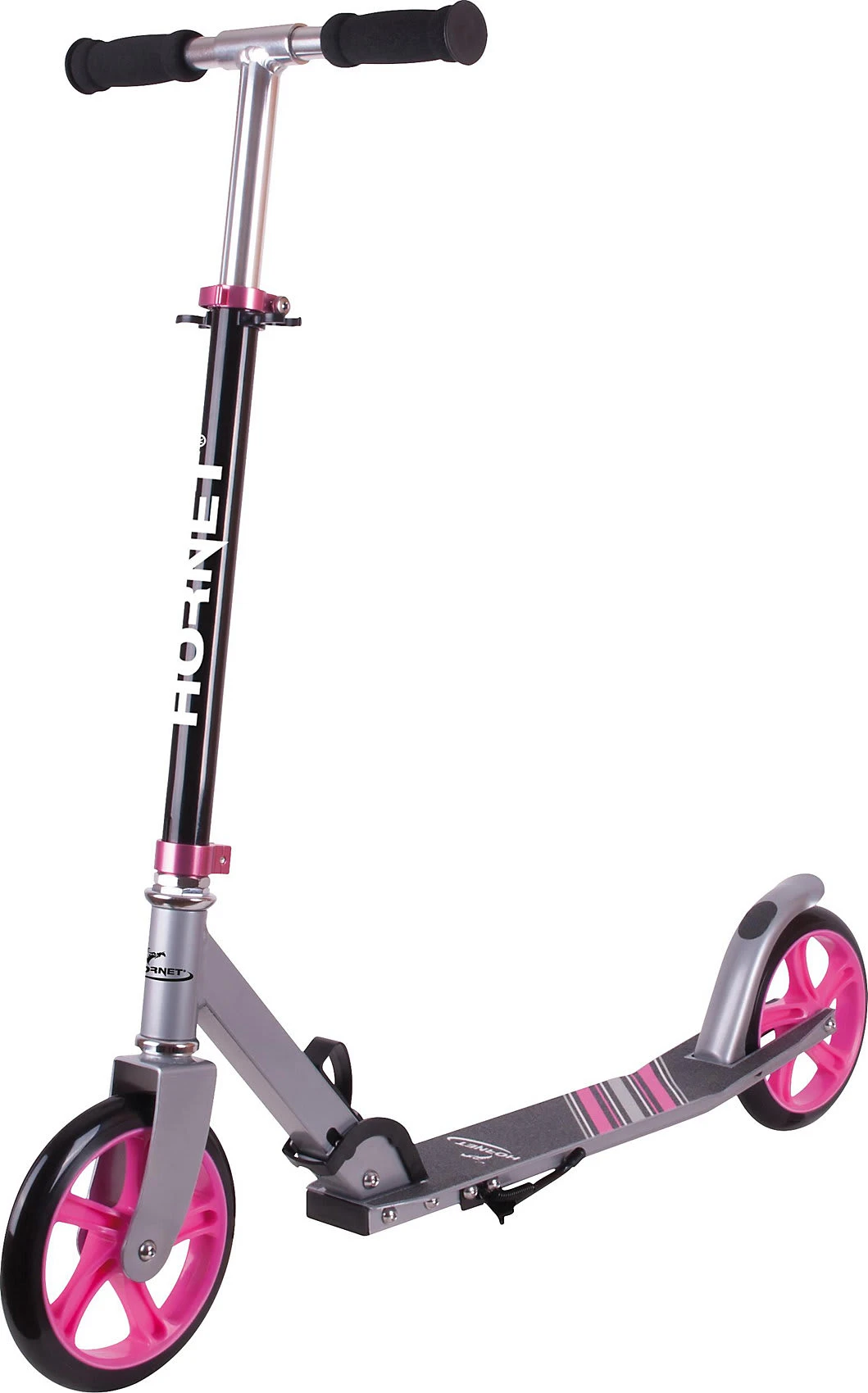 Stylisch und funktional! Mit dem Hornet Scooter 200 von Hudora können die Alltagswege lässig absolviert werden und auch Ausflügen in den Park, oder kleinen Stunts steht nichts im Wege. Der Scooter hat einen praktischen Klappmechanismus und kann einfach transportiert und mitgenommen werden. Die stabilen PU-Rollen punkten mit leichtläufigen ABEC 7 Kugellagern und der Lenker kann in der Höhe angepasst werden. Für Trittsicherheit sorgt das angenehm breite Deck mit rutschhemmendem Belag und der Seitenständer macht das Abstellen leichter. Gebremst wird mit der Hinterradbremse. Los geht es zum coolen Cruisen!