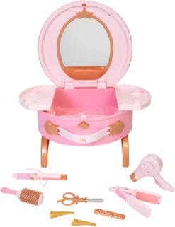 Mit diesem tollen Schminktischlein von Jakks Pacific macht das Prinzessin-Spielen besonders viel Spaß! Der Schminktisch befindet sich in einem aufklappbaren Köfferchen, sodass er sich besonders gut zu der besten Freundin mitnehmen lässt. Das Tischlein ist mit einem ovalen Spiegel, Stauraum für Zubehör und zwei seitlichen Ablageflächen ausgestattet und kommt mit allem, was man zum Frisieren braucht: hier sind ein Kamm, eine Bürste und zwei Haarclips dabei. Auch realistisch aussehende Frisierwerkzeuge sind in dem Set enthalten: ein Lockenstab, ein Föhn mit Sound, ein Glätteisen und eine Schere.
