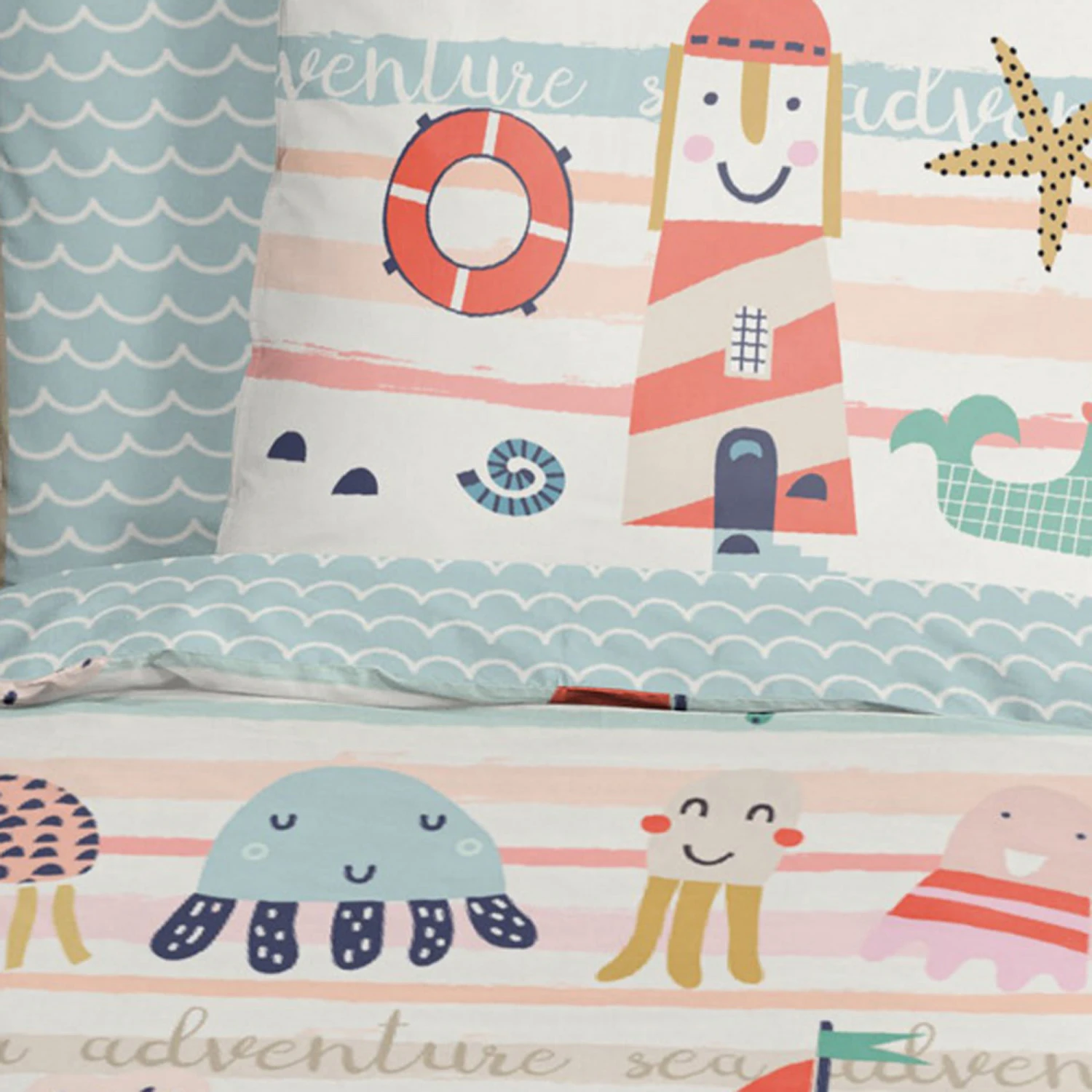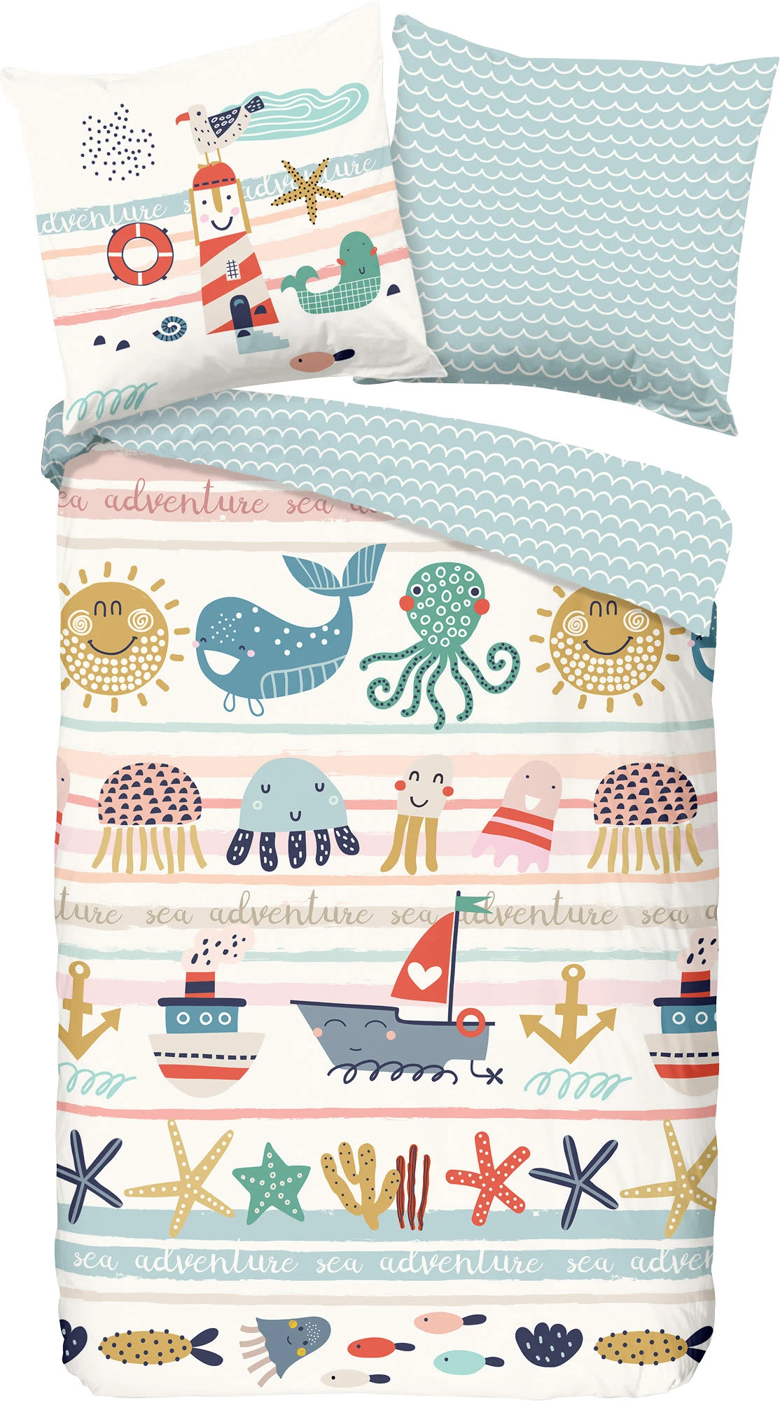 Good Morning Renforcé Kinder-Wendebettwäsche „Sea“. Die süße Bettwäsche im maritimen Look macht Lust auf Meer. Liebevoll gemalte Details wie Leuchtturm, Sonne, Schiff, Wal, Seestern etc. verbreiten Urlaubs-Feeling. Dazu passt das Allover-Wellenmotiv der Rückseite perfekt. Auf dem glatten Gewebe kommen die Farben besonders ausdrucksstark zur Geltung. Es überzeugt durch seinen angenehm weichen Griff und das gute Gefühl auf der Haut. Atmungsaktiv, strapazierfähig und temperaturausgleichend. Unkompliziert zu beziehen durch den praktischen Reißverschluss.