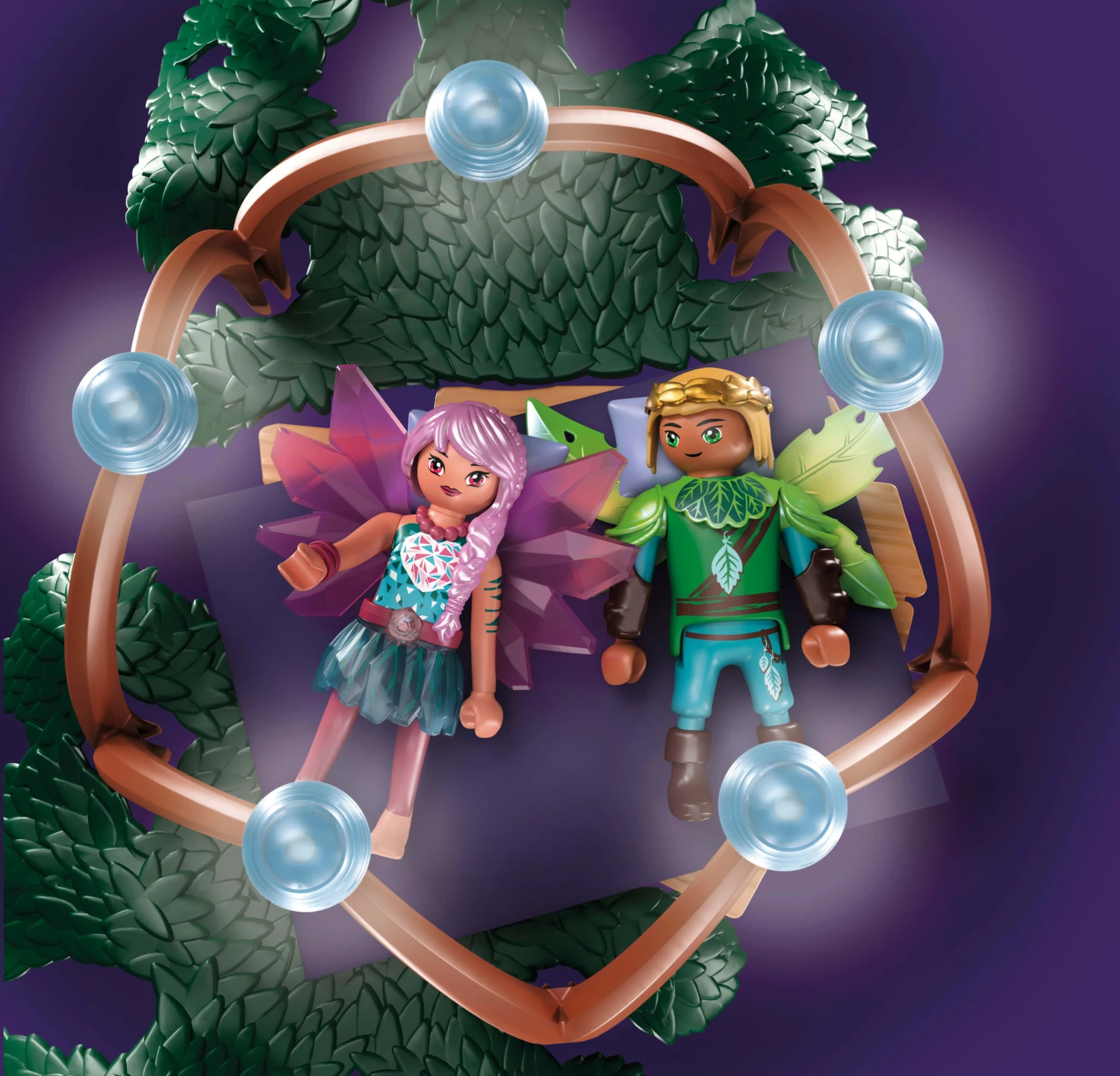Tief im verwunschenen Feenwald steht der geheimnisvolle Gemeinschaftsbaum. Er ist nicht nur Wohnort der Feen, sondern auch sicherer Rückzugsort der magischen Wesen und ihrer befreundeten Seelentiere. Jede Feenart ist mit ihrem Symbol auf dem Gemeinschaftsbaum vertreten. Für fröhliche Plauderstunden treffen sich die Feen im gemütlichen Gemeinschaftsraum. Zum Beobachten der Sterne nutzen sie das Fernrohr des Observatoriums. Auf der seitlichen Holzplattform lädt der filigrane Pavillon mit seinen nachleuchtenden Lampions und kuscheligen Kissen und Decken zum Träumen ein. Im Turm des Gemeinschaftsbaumes befindet sich ein Sternenprojektor mit welchem ein zauberhafter Sternenhimmel an die Zimmerdecke projiziert werden kann. Die treuen Seelentiere haben unter der Baumwurzel einen lauschigen Unterschlupf. Hier ist ausreichend Platz, um zu fressen, zu spielen und sich auszuruhen. Das Spielfigurenset enthält eine Crystal Fairy mit Kristallschmetterling, eine Knight Fairy mit Wolf, einen Forest Fairy-Mann mit Luchs, einen Gemeinschaftsbaum mit drei Ebenen – Küche, Gemeinschaftsraum und Baumwurzel sowie Pavillon, Turmzimmer, Observatorium mit Fernrohr, Sternenprojektor und viele weitere Extras. Neues Aufbauerlebnis: Dank nummerierter Beutel beginnt der Spielspaß schon beim Auspacken! Figuren: 1 Forest-Fairy Mann, 1 Crystal Fairy, 1 Knight Fairy Tiere: 1 Seelentier Luchs, 1 Seelentier Schmetterling, 1 Seelentier Wolf, 1 Specht Zubehör: 1 Gemeinschaftsbaum mit Sternenprojektor, 1 Schaukel, 1 Tisch, 1 Ofen, 1 Baumstumpf-Treppe, 3 Baumstumpf-Hocker, 3 Kissen, 2 Hocker gepolstert, 1 Teppich, 1 Decke weiß, 1 Decke Traube, 1 Bilderrahmen, 1 Set Spielkarten sortiert, 1 Set Spielkarten getrennt, 2 Set Spielkarten gebündelt, 1 Forest Fairies Wappen, 1 Crystal Fairies Wappen, 1 Knight Fairies Wappen, 1 Trage, 1 Getreidegarbe, 2 Grasbüschel, 1 Bücherregal, 1 Set Bücher, 1 Krug, 2 Äpfel, 1 Tragekorb, 1 Korb, 1 Pfanne, 1 Stielkasserolle, 4 Teller, 4 Gläser, 2 Flaschen, 2 Blüten, 1 Tierpflegeset – 6-tlg. , 1 Paar Flügel Forest Fairy, 1 Paar Flügel Crystal Fairy, 1 Paar Flügel Knight Fairy, 1 Haarkranz Forest Fairy Mann, 1 Kragen Forest Fairy Mann, 1 Paar Armmanschetten Forest Fairy Mann, 1 Kragen Knight Fairy, 1 Haarreif mit Hörner Knight Fairy, 1 Gürtel-Ansteck-Feder Knight Fairy, 1 Rock Crystal Fairy, 1 Halskette Crystal Fairy, 1 Armreif Crystal Fairy, 1 Gürtel-Ansteck-Kristall Crystal Fairy, 1 Rüstung Seelentier Wolf