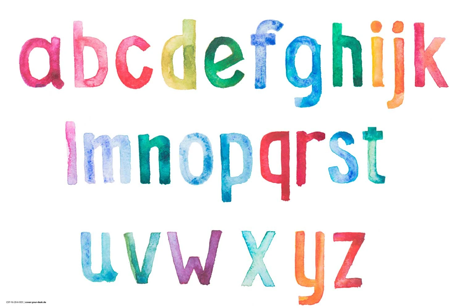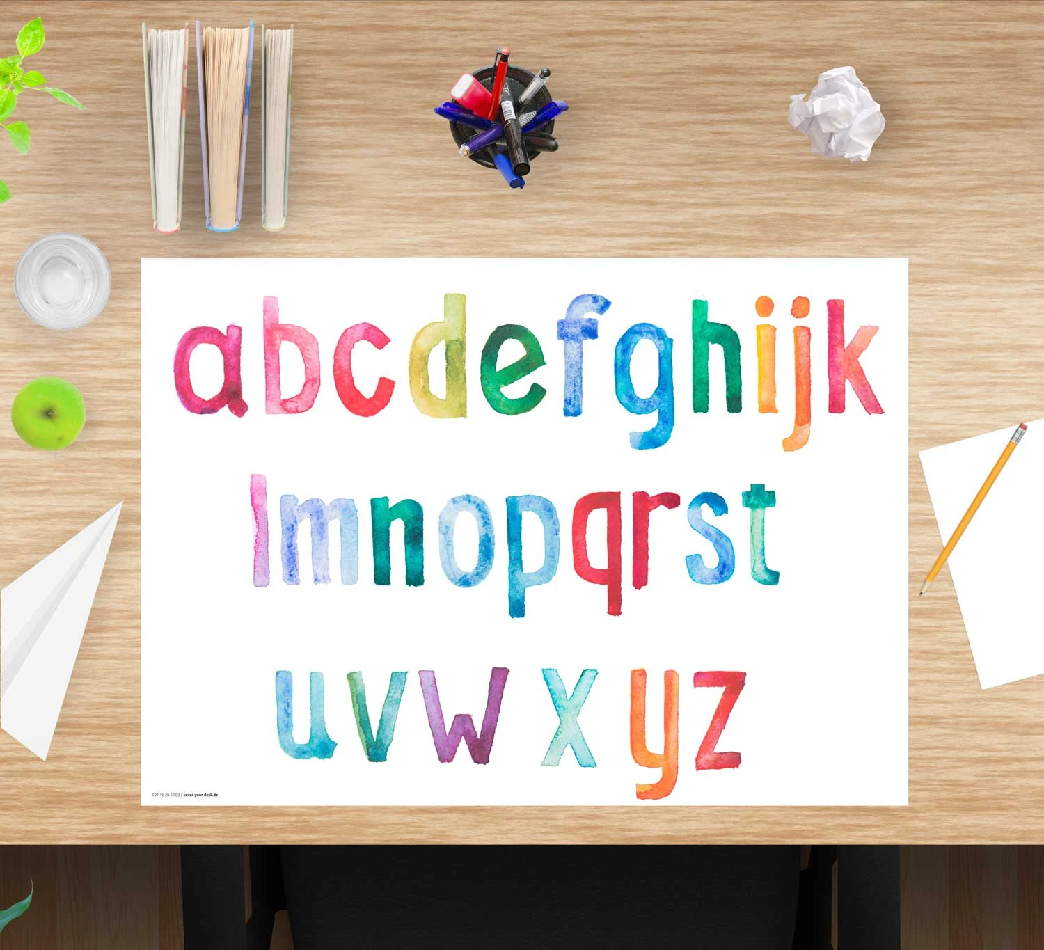 Ein Motiv mit Lerneffekt – das ABC in Kleinbuchstaben bunt und kreativ dargestellt. Perfekt für Kinder und junge Schüler. So lernen sie spielend leicht und bekommen zugleich eine praktische Schutzmatte für den Schreibtisch!