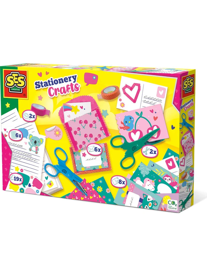 – Inhalt: 2 Zick-Zack-Scheren, 2 Rollen buntes Washi-Tape, 6 Blätter Briefpapier, 8 Postkarten, beschreibbare Aufkleber in 19 Farben, 6 Briefumschläge