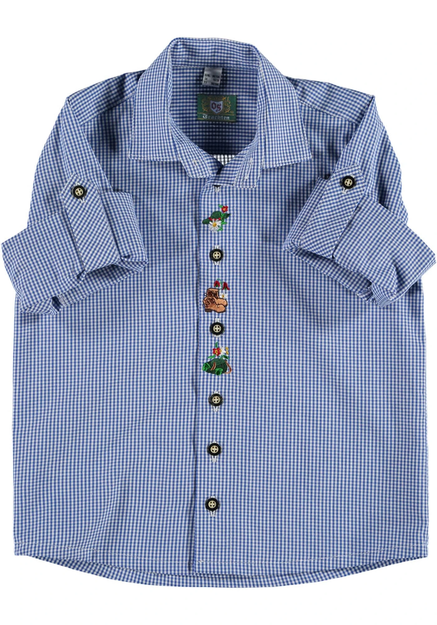 Zum Verlieben schön ist dieses kleinkarierte Hemd für kleine Trachtenfans. Blickfang ist die kunstvoll bestickte Knopfleiste, typisch auch die Knöpfe in Hirschhorn-Optik. Die langen Ärmel können Sie hochkrempeln und mit Lasche und Knopf fixieren. In vier Farben zur Auswahl, alle aus reiner Baumwolle gefertigt, von Größe 74 bis 182 in der aktuellen Kollektion von OS Trachten.