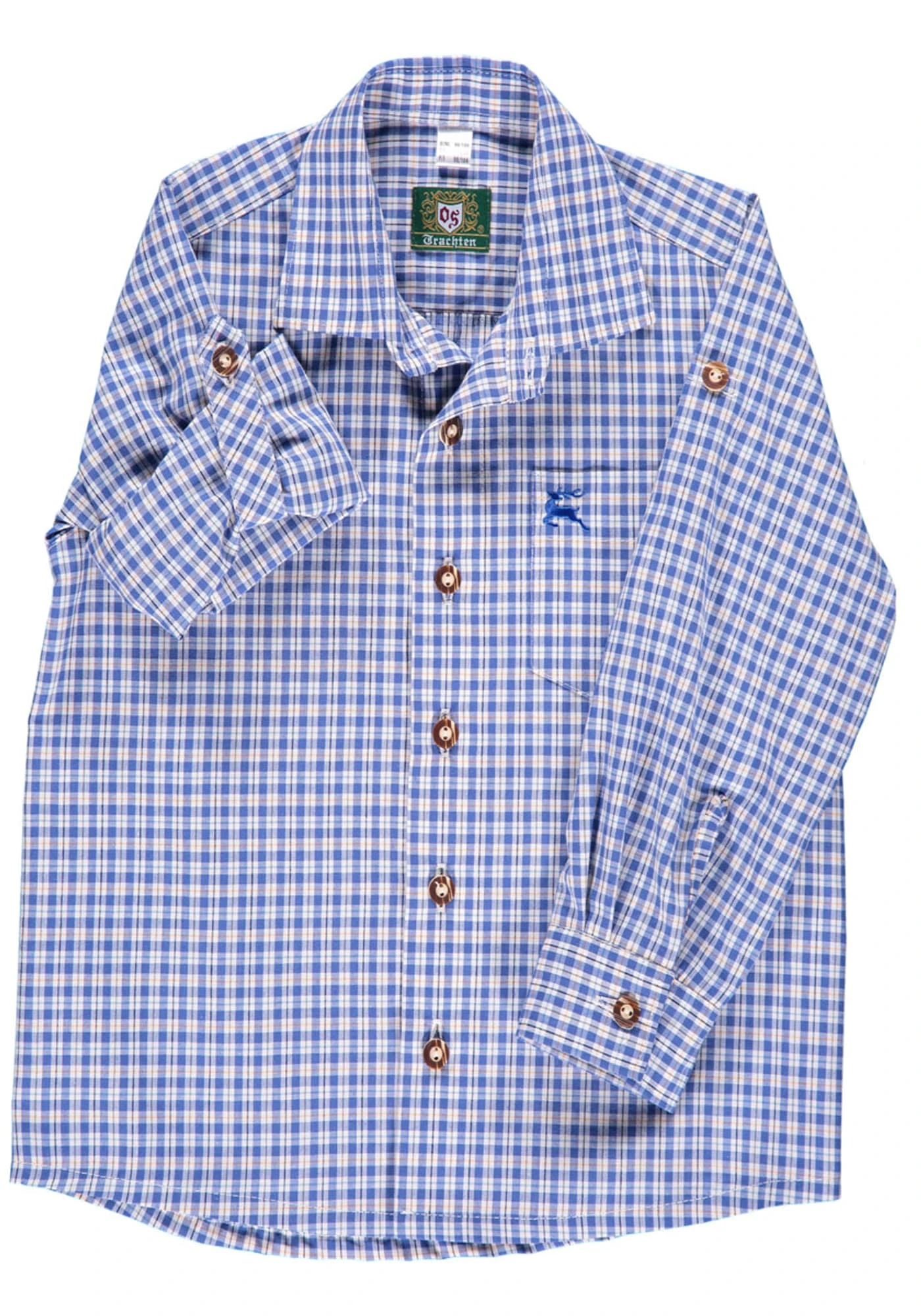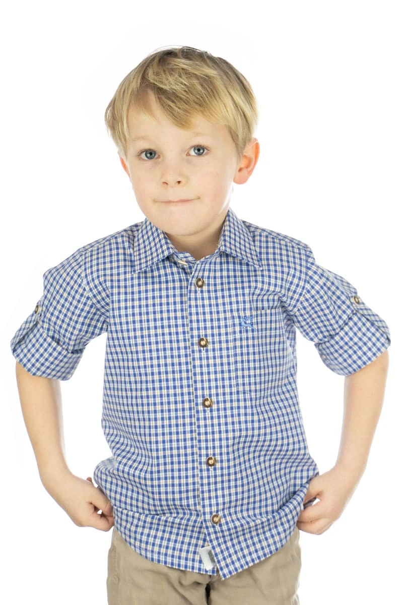 Zur Lederhose und zur Jeans passt dieses Trachtenhemd für Kinder. Die zweifarbigen Karokombinationen sehen frisch aus – und machen gute Laune. Aus pflegeleichtem Mischgewebe mit 60 % Baumwolle, mit allen Eigenschaften, die ein echtes Trachtenhemd benötigt: Knöpfe in Hirschhorn-Optik und Krempelärmel, die mit einer Lasche festgehalten werden. Und in die kleine Brusttasche mit Stickerei passen alle Schätze, die der Nachwuchs auf der Bergtour findet.